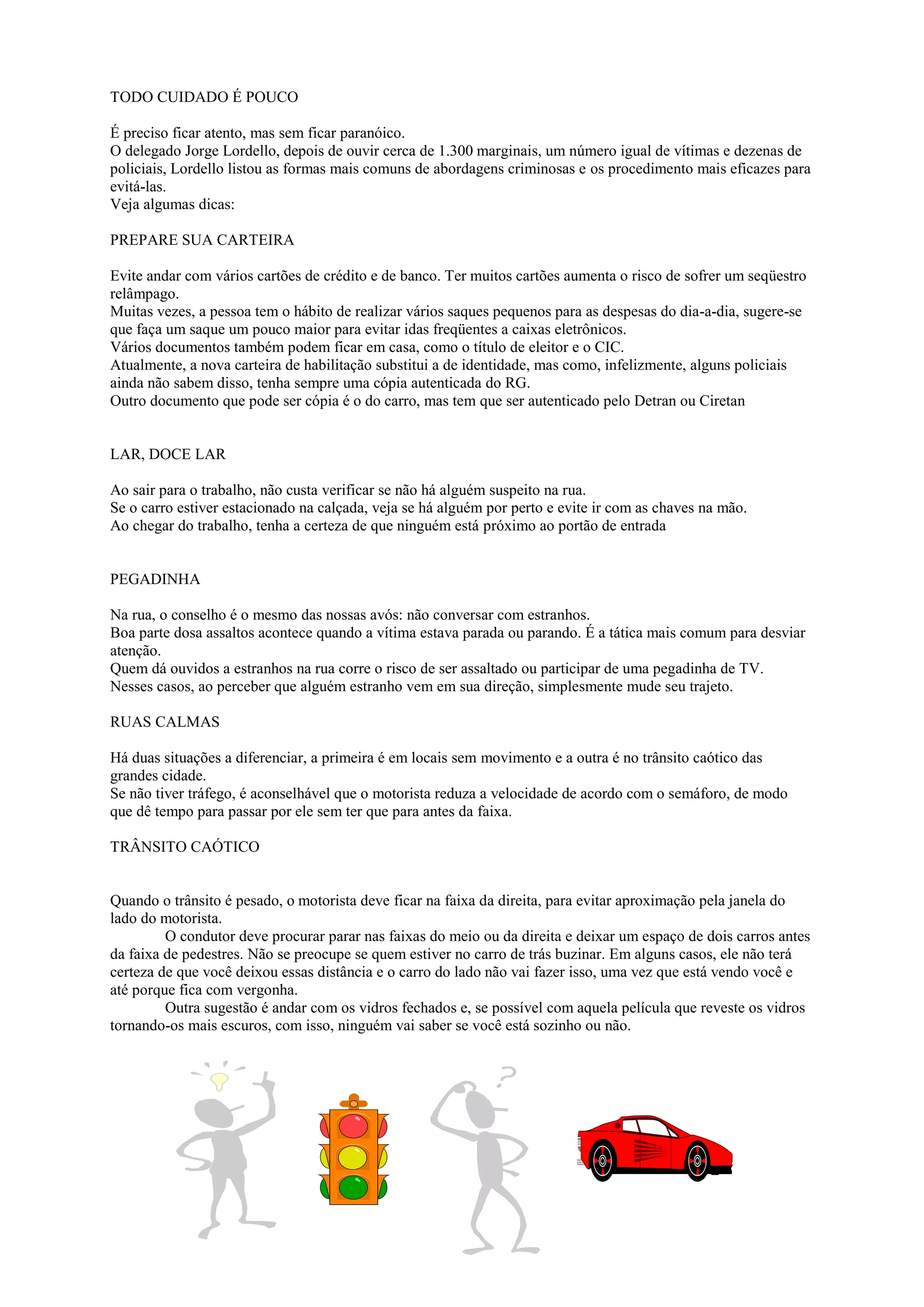 O documento fornece dicas sobre como se proteger de abordagens criminosas, incluindo preparar a carteira com poucos cartões e documentos, verificar a rua antes de sair de casa ou chegar, não conversar com estranhos e tomar cuidado em locais com pouco ou muito trânsito.