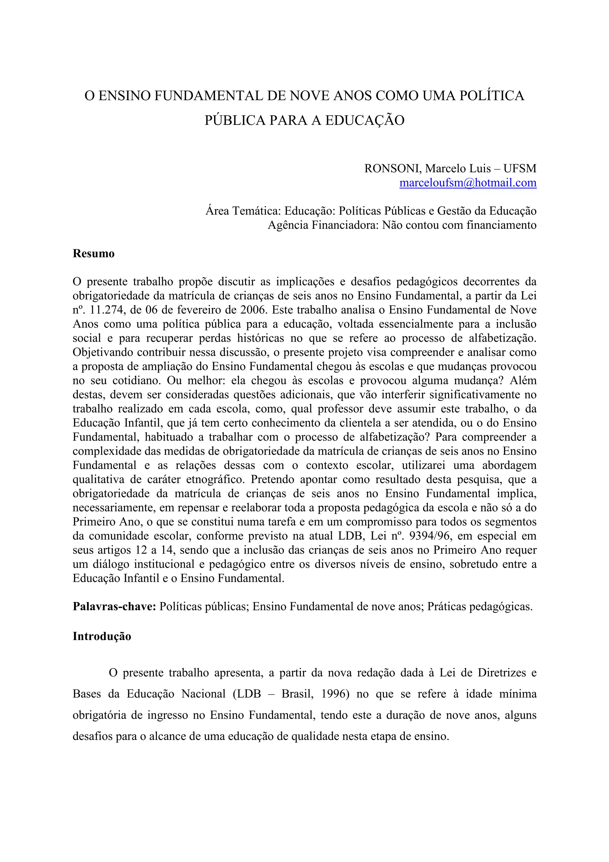 O documento discute o Ensino Fundamental de Nove Anos como uma política pública brasileira para incluir crianças de 6 anos na escola. A política amplia a duração do Ensino Fundamental de 8 para 9 anos com o objetivo de promover inclusão social e recuperar perdas no processo de alfabetização. A implementação da política requer mudanças na proposta pedagógica, currículo e formação de professores para atender às necessidades das crianças mais novas.