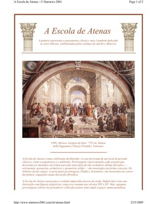 A pintura A Escola de Atenas de Rafael representa filósofos e pensadores da Grécia Antiga reunidos em debate. A obra celebra a filosofia e as artes liberais em uma arquitetura inspirada no projeto de Bramante para a Basílica de São Pedro. As figuras de Platão e Aristóteles dominam a composição no centro da pintura.