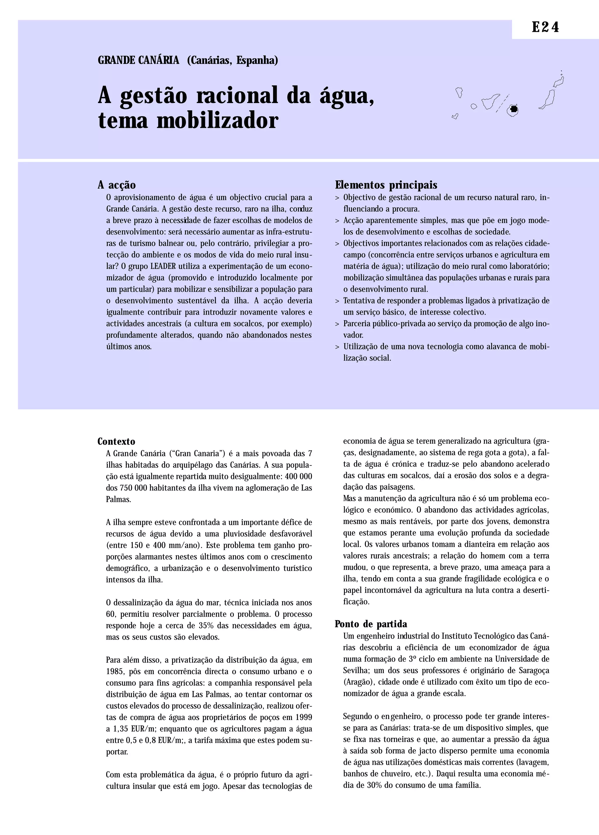 Este documento descreve um projeto na ilha de Grande Canária, Espanha, que tem como objetivo promover o uso sustentável da água através da instalação de economizadores de água e campanhas de sensibilização. O projeto visa mobilizar a população rural e urbana para a proteção deste recurso natural escasso e testar novas abordagens de gestão da procura de água.