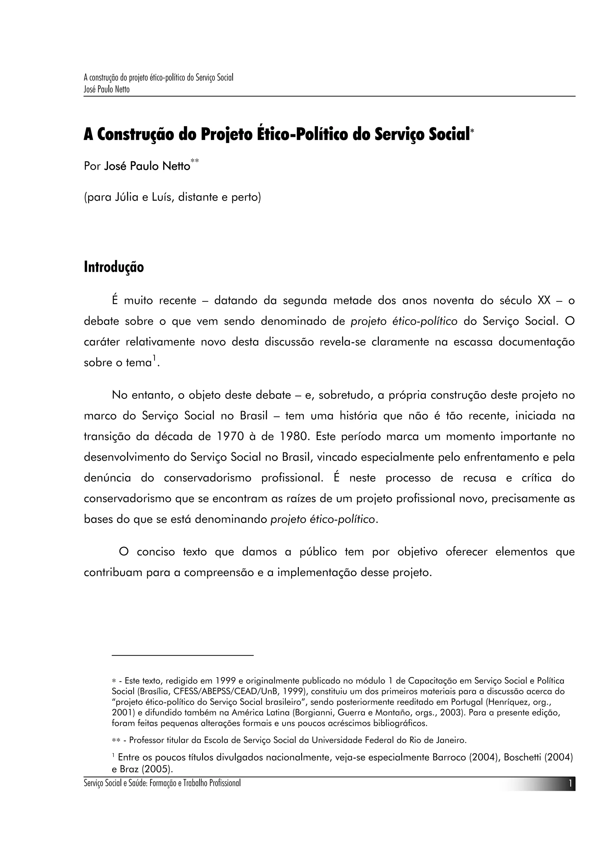 1. O documento discute a construção do projeto ético-político do Serviço Social brasileiro.
