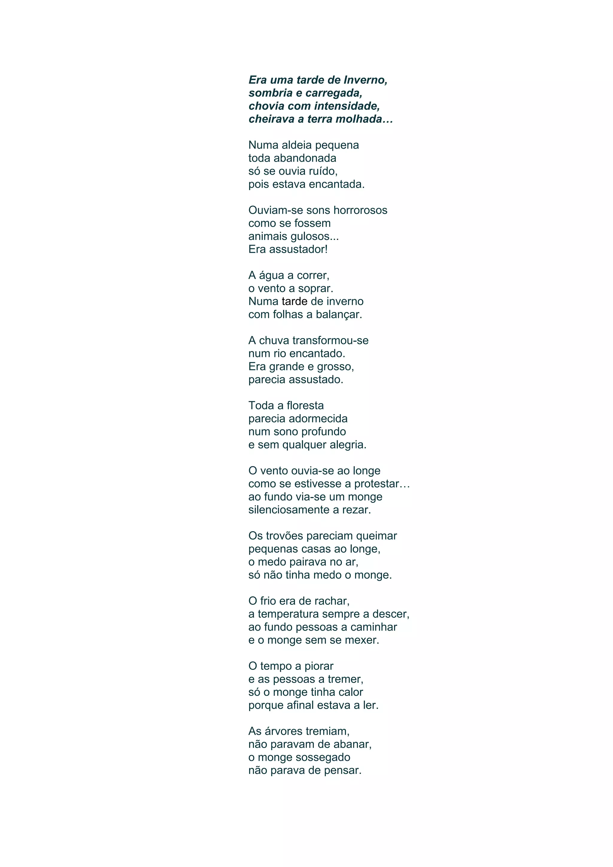 Uma tarde de inverno tempestuosa na floresta é descrita, com sons assustadores e chuva forte. Duas crianças ficam presas na floresta e choram com frio e desespero. Um monge lê sob uma árvore procurando calma, mas fica aborrecido quando termina o livro e precisa de outro para se entreter.