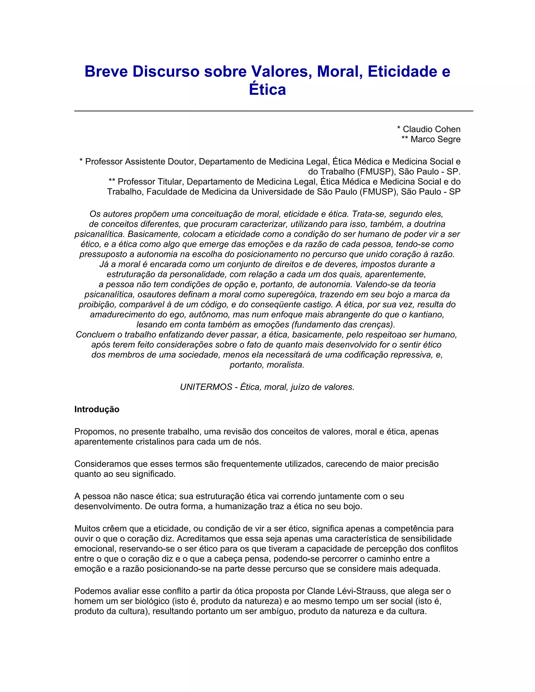O documento discute as diferenças entre valores, moral e ética. Define valores como crenças duradouras que guiam a conduta, moral como normas sociais impostas e punidas, e ética como autonomia na percepção dos conflitos entre emoção e razão e posicionamento coerente. A ética depende da consciência, autonomia e coerência, diferente da moral e religião.