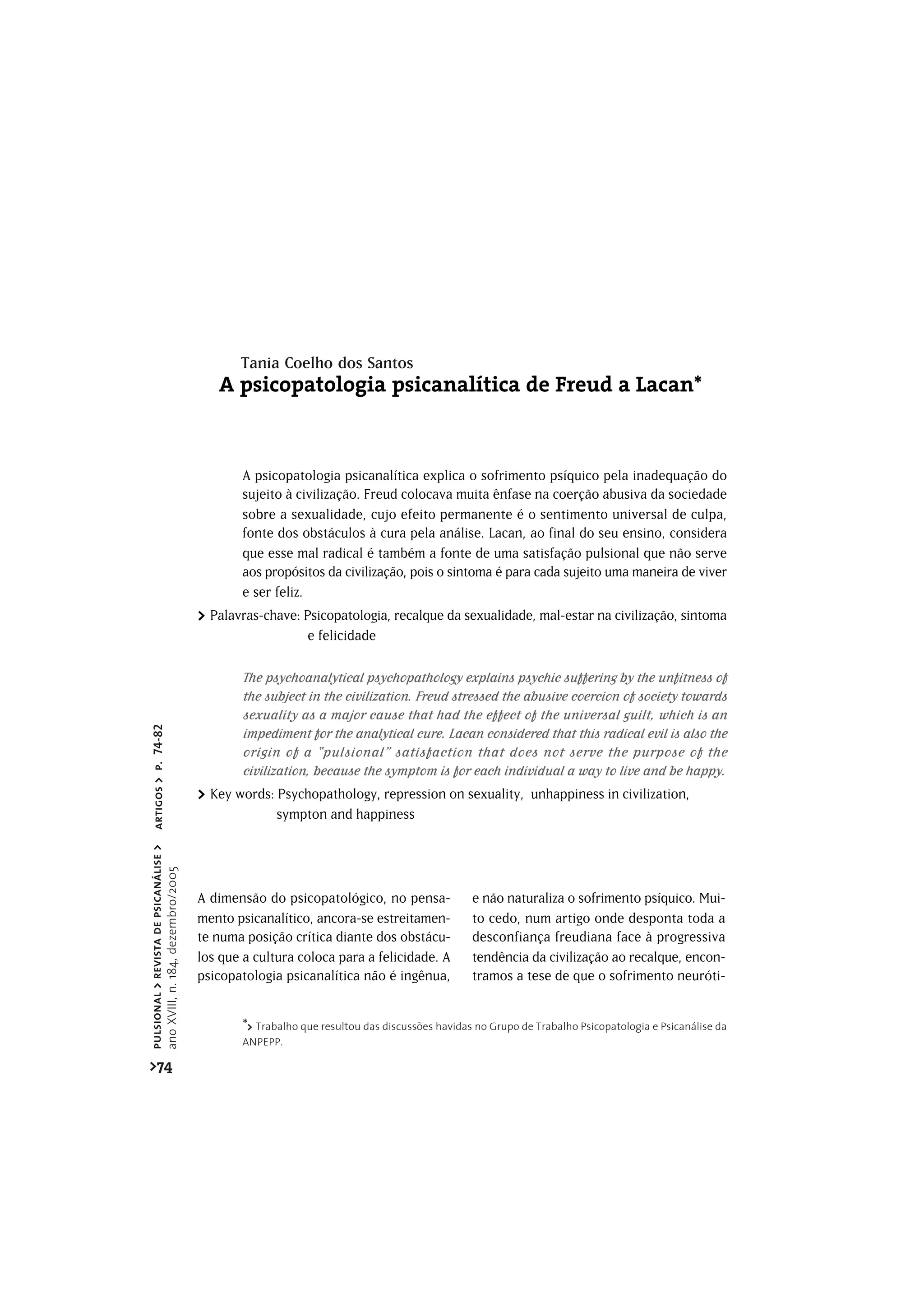 O documento discute as visões de Freud e Lacan sobre a psicopatologia psicanalítica. Freud via o sofrimento psíquico como resultado da repressão da sexualidade pela sociedade, enquanto Lacan considerava que o sintoma é uma forma de satisfação pulsional para o indivíduo.