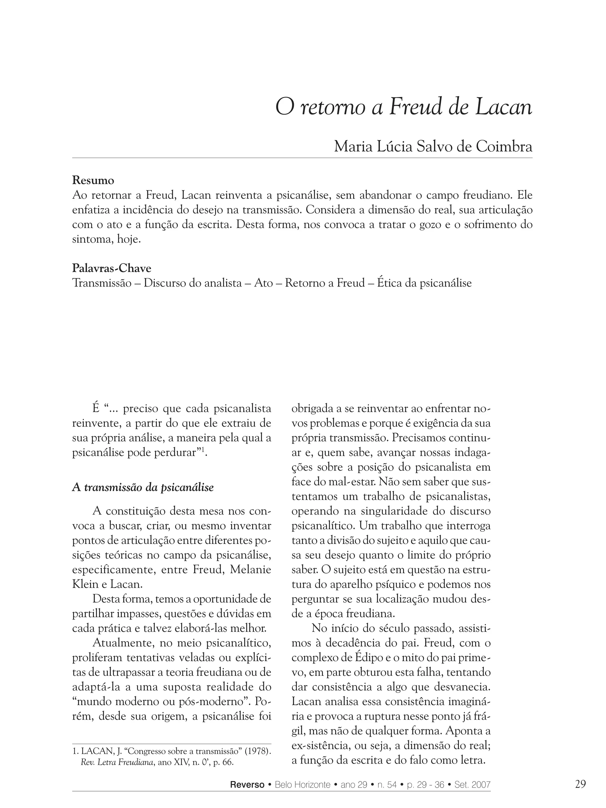 O documento discute o retorno de Lacan à obra de Freud e como ele reinventou a psicanálise sem abandonar o campo freudiano. Lacan enfatizou a dimensão do real, sua articulação com o desejo e a função da escrita. Desta forma, convocou os psicanalistas a tratar o gozo e o sofrimento do sintoma.