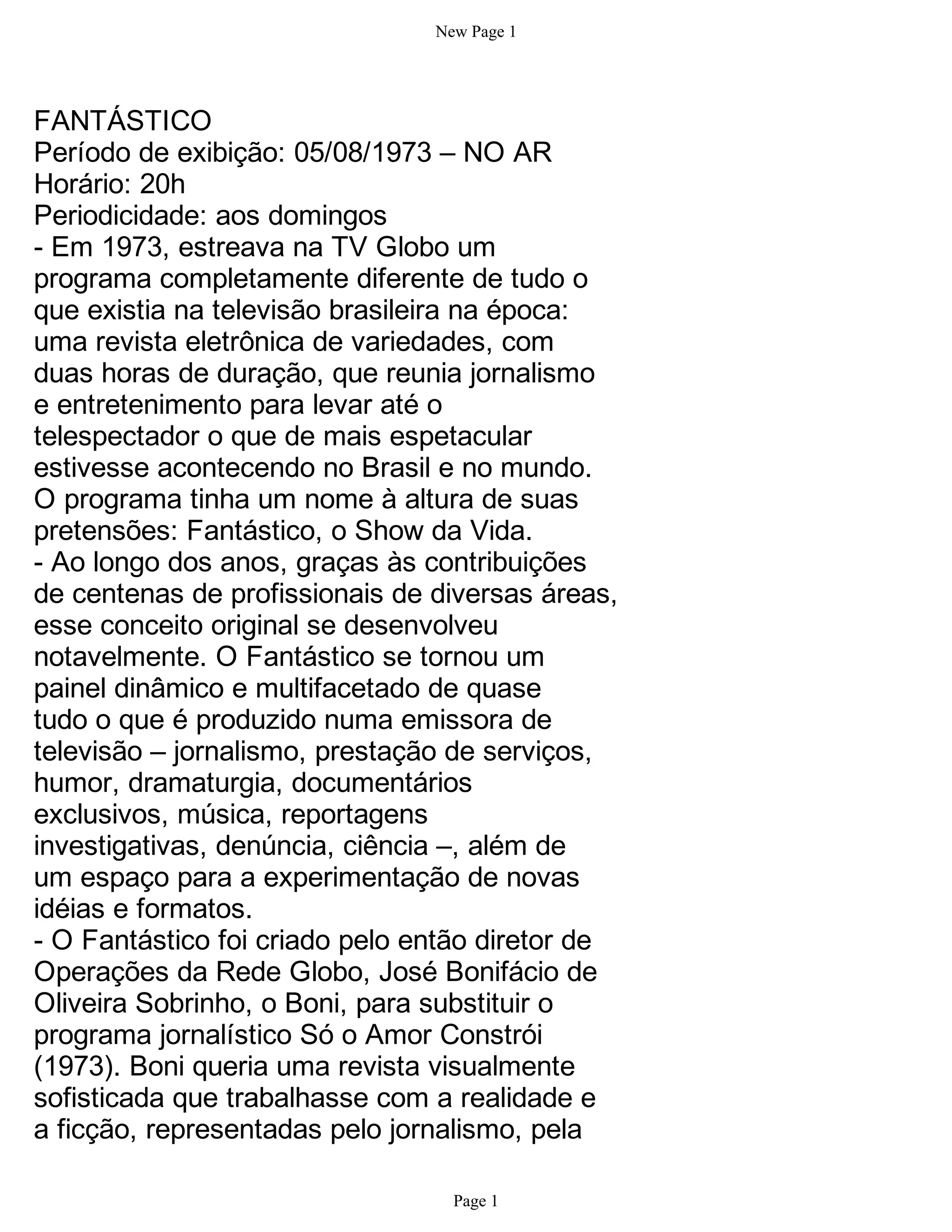O documento descreve a criação e os primeiros anos do programa Fantástico na TV Globo, incluindo sua estreia em 1973 com uma variedade de matérias jornalísticas e de entretenimento. O programa se tornou um sucesso e contribuiu para o desenvolvimento de novos formatos na televisão brasileira, apresentando também quadros de humor e musicais.