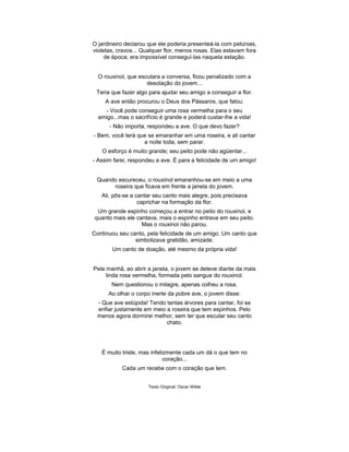 O documento descreve uma história sobre um lenhador que deixava seu filho pequeno aos cuidados de uma raposa que era tratada como animal de estimação. Os vizinhos alertavam o lenhador sobre os riscos, mas ele confiava na raposa. Um dia, o lenhador chega em casa e vê a boca da raposa ensanguentada, mas encontra seu filho dormindo seguramente com uma cobra morta ao lado.