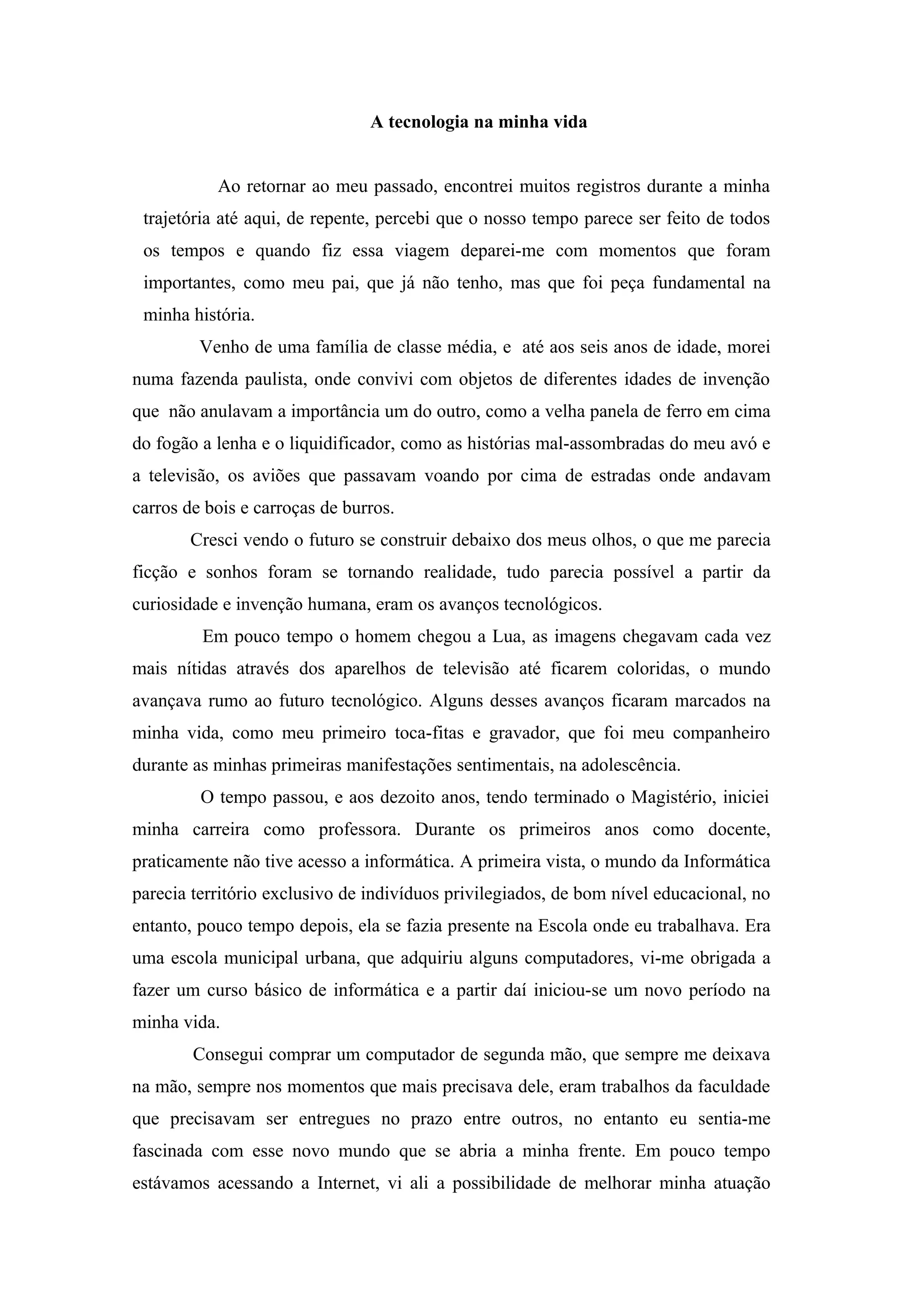 O documento descreve a trajetória da autora com a tecnologia ao longo de sua vida, desde a infância em uma fazenda até os dias atuais como professora. Ela observou a evolução tecnológica, como da televisão em preto e branco para colorida, e seu primeiro contato com computadores. Atualmente, ela tem acesso à internet na escola e vê como isso beneficia seus alunos.