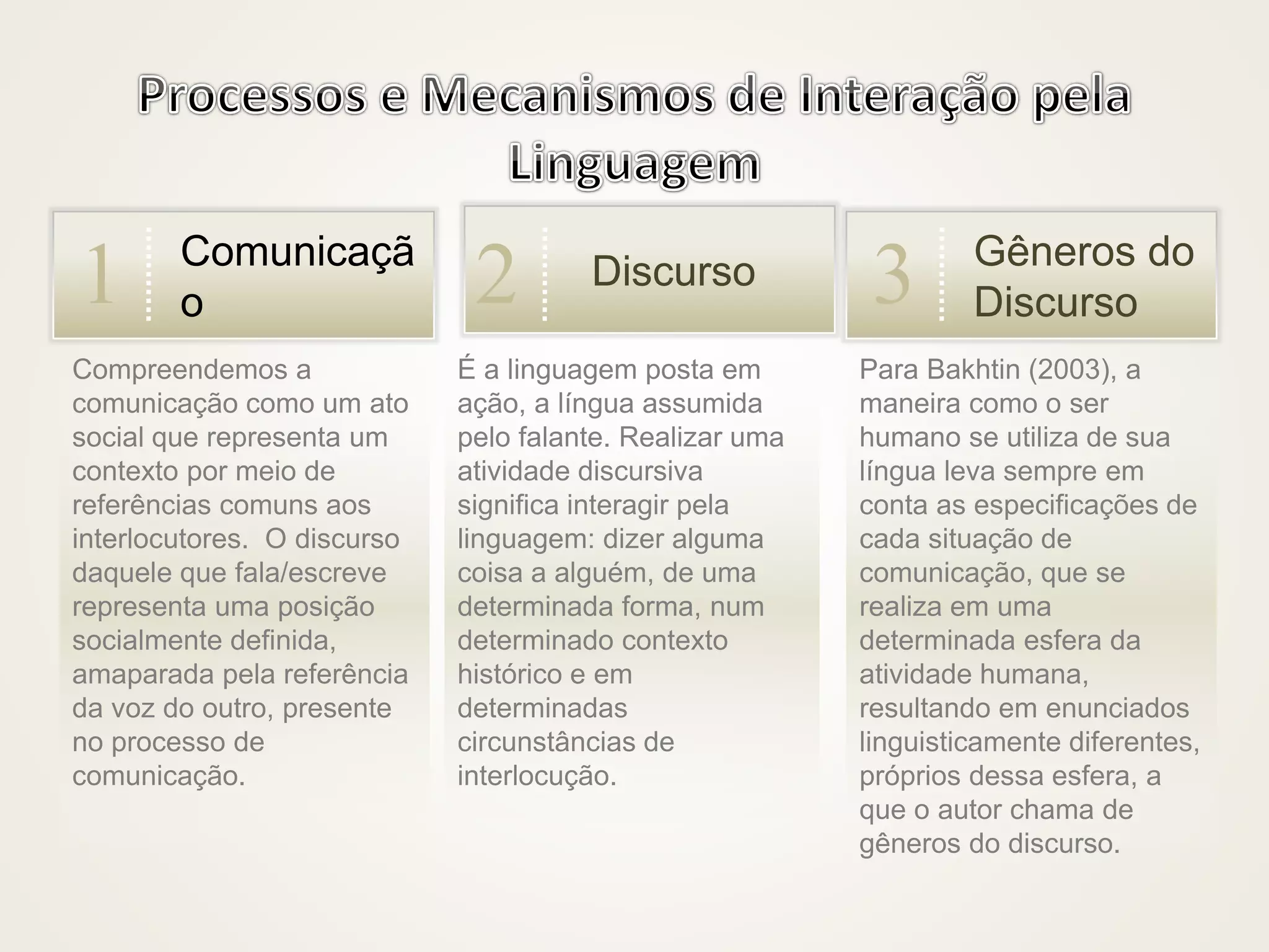 O documento discute a comunicação e os gêneros do discurso segundo Bakhtin. Apresenta três pontos principais: 1) A linguagem leva em conta a situação de comunicação e resulta em enunciados próprios de cada esfera da atividade humana, chamados de gêneros do discurso. 2) A linguagem é posta em ação pelo falante em interação e contexto histórico. 3) A comunicação representa um contexto através de referências compartilhadas entre os interlocutores.
