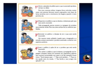 O documento discute a estrutura e linguagem de textos publicitários. Define texto publicitário como aquele que visa convencer o destinatário a consumir um produto ou serviço, criando uma imagem positiva por meio de símbolos e valores. Explica que pode ser de produto, serviço ou ideia, e utiliza diversas estratégias como título, imagem, texto, marca, slogan entre outras para persuadir o público-alvo.