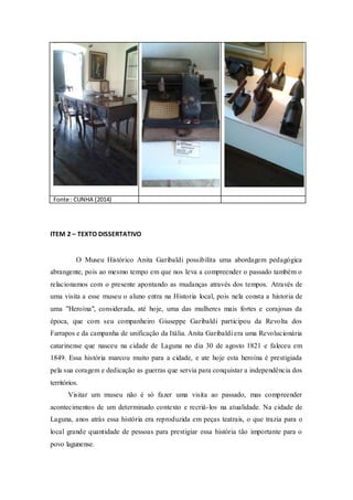 O documento descreve uma visita de estudantes ao Museu Histórico Anita Garibaldi em Laguna, Santa Catarina. O museu preserva artefatos da Guerra dos Farrapos, da República Juliana e da fundação da cidade. Ele é mantido pela Fundação Lagunense de Cultura e recebe visitas escolares agendadas para aprender sobre a história local, incluindo a heroína Anita Garibaldi.
