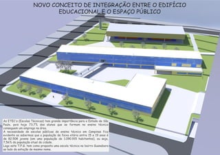 O documento propõe a construção de uma Escola Técnica (ETEC) no bairro Guanabara em Campinas para atender a demanda por ensino técnico público na cidade, já que as ETECs atuais formam 73,7% dos alunos que conseguem emprego na área técnica e a população jovem em Campinas é de 82.508 entre 15-19 anos.