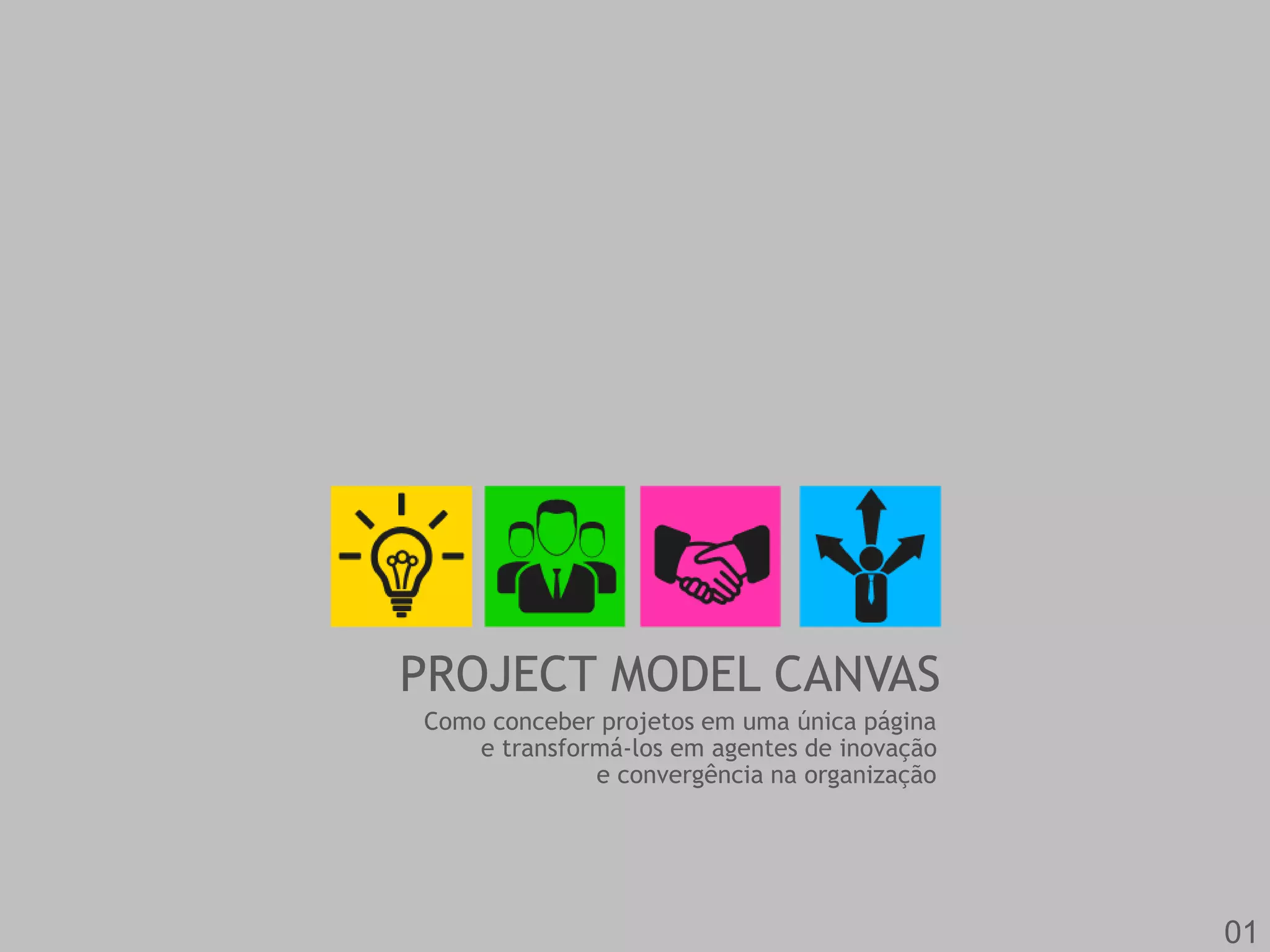 O documento apresenta o Project Model Canvas, um método para conceber projetos em uma única página visual, integrando os principais elementos em blocos e estabelecendo as amarrações necessárias entre eles. O método consiste em quatro etapas: conceber o projeto por meio de um fluxo de trabalho de 13 passos; integrar os blocos para fazer as amarrações; resolver ações de balanceamento do projeto para equipe, clientes e patrocinadores; e compartilhar as informações do projeto.