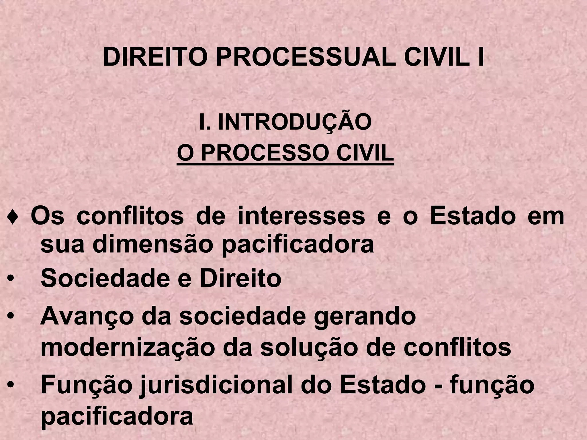 O documento apresenta uma introdução ao Direito Processual Civil, discutindo conceitos-chave como processo civil, jurisdição e mecanismos de pacificação social. Também resume brevemente a história do direito processual, características, normas processuais e fontes deste ramo do direito.