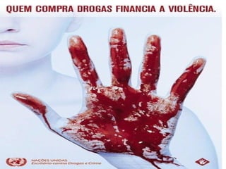 O documento discute os motivos associados ao uso de drogas, incluindo problemas pessoais e sociais, influência de amigos e fugir de problemas. Também menciona que a dependência de álcool foi a primeira a ser reconhecida como doença, e atualmente a dependência é considerada uma doença crônica caracterizada pelo uso compulsivo de drogas.