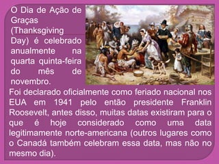 O Dia de Ação de Graças é celebrado anualmente nos EUA em novembro para agradecer pela colheita. Sua origem remonta a um jantar de celebração oferecido por colonos ingleses e nativos americanos após uma colheita bem-sucedida. A data foi oficializada pelo presidente Roosevelt e é comemorada com refeições tradicionais como peru assado.