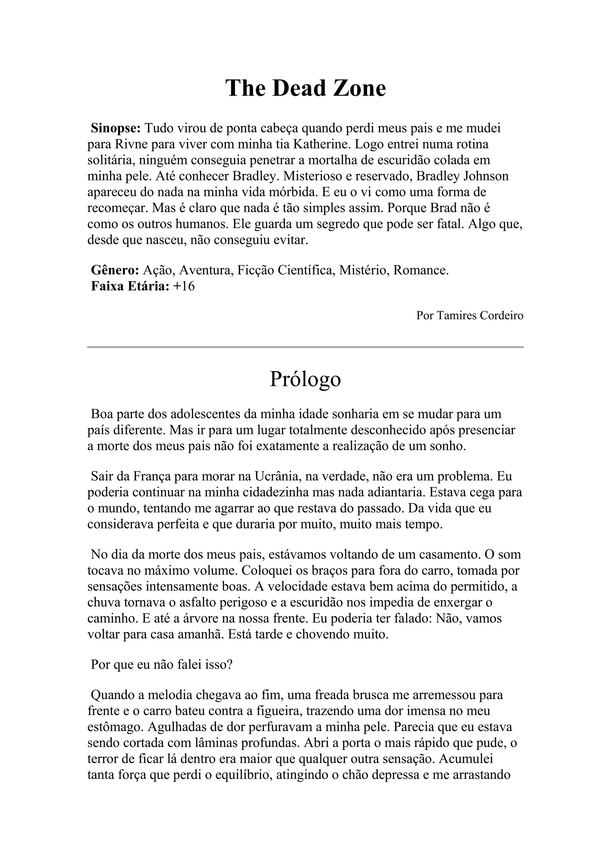 The Dead Zone Sinopse:Tudo virou de ponta cabeça quando perdi meus pais e me mudei para Rivne para viver com minha tia Katherine. Logo entrei numa rotina solitária, ninguém conseguia penetrar a mortalha de escuridão colada em minha pele. Até conhecer Bradley. Misterioso e reservado, Bradley Johnson apareceu do nada na minha vida mórbida. E eu o vi como uma forma de recomeçar. Mas é claro que nada é tão simples assim. Porque Brad não é como os outros humanos. Ele guarda um segredo que pode ser fatal. Algo que, desde que nasceu, não conseguiu evitar. Gênero: Ação, Aventura, Ficção Científica, Mistério, Romance. Faixa Etária: +16 Por Tamires Cordeiro Prólogo Boa parte dos adolescentes da minha idade sonharia em se mudar para um país diferente. Mas ir para um lugar totalmente desconhecido após presenciar a morte dos meus pais não foi exatamente a realização de um sonho. Sair da França para morar na Ucrânia, na verdade, não era um problema. Eu poderia continuar na minha cidadezinha mas nada adiantaria. Estava cega para o mundo, tentando me agarrar ao que restava do passado. Da vida que eu considerava perfeita e que duraria por muito, muito mais tempo. No dia da morte dos meus pais, estávamos voltando de um casamento. O som tocava no máximo volume. Coloquei os braços para fora do carro, tomada por sensações intensamente boas. A velocidade estava bem acima do permitido, a chuva tornava o asfalto perigoso e a escuridão nos impedia de enxergar o caminho. E até a árvore na nossa frente. Eu poderia ter falado: Não, vamos voltar para casa amanhã. Está tarde e chovendo muito. Por que eu não falei isso? Quando a melodia chegava ao fim, uma freada brusca me arremessou para frente e o carro bateu contra a figueira, trazendo uma dor imensa no meu estômago. Agulhadas de dor perfuravam a minha pele. Parecia que eu estava sendo cortada com lâminas profundas. Abri a porta o mais rápido que pude, o terror de ficar lá dentro era maior que qualquer outra sensação. Acumulei tanta força que perdi o equilíbrio, atingindo o chão depressa e me arrastando