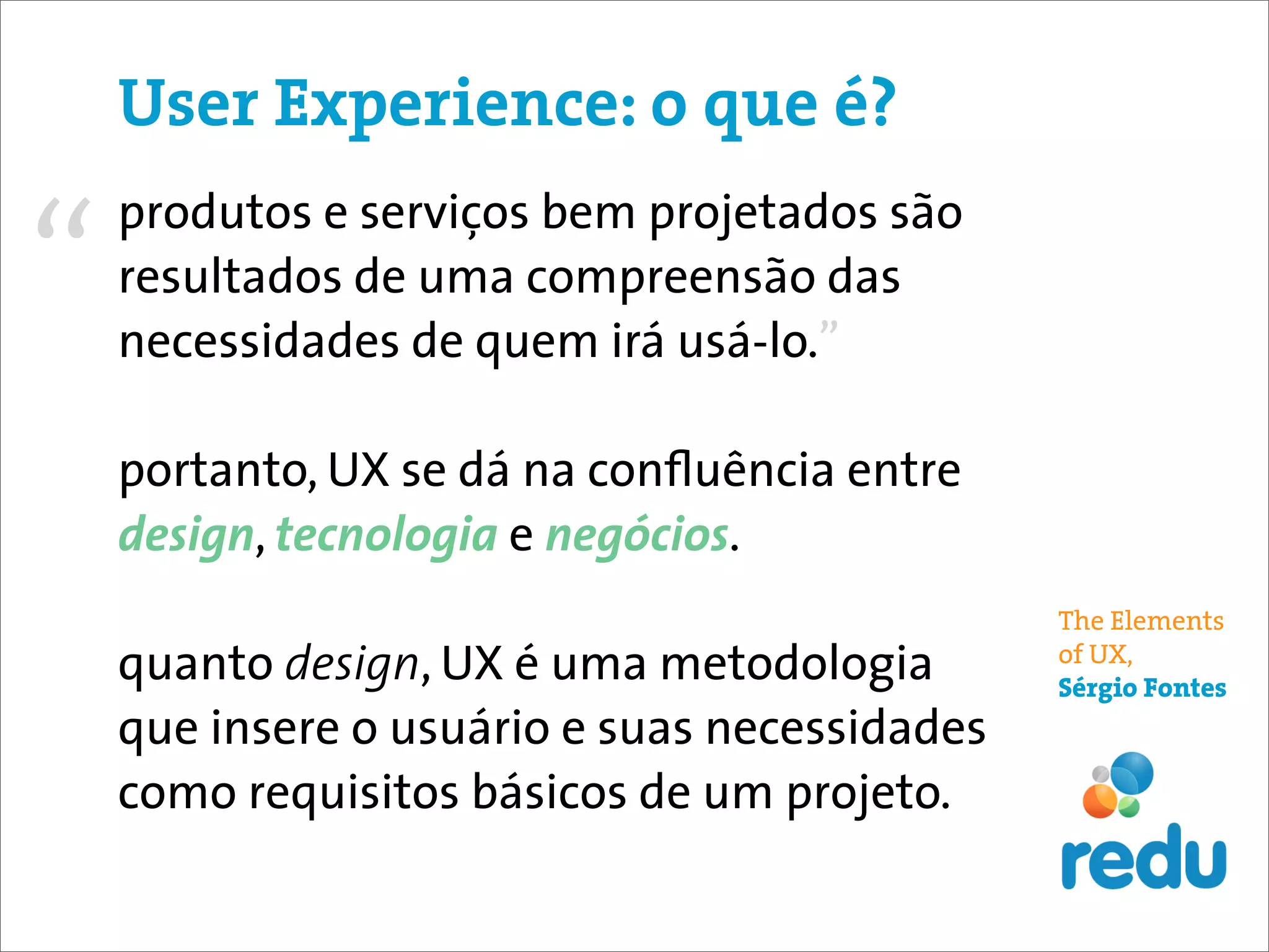 O documento descreve os elementos da experiência do usuário (UX) de acordo com Jesse James Garrett. A UX envolve planejamento estratégico, design, tecnologia e negócios com foco nas necessidades do usuário. Garrett define UX como um processo multidisciplinar com cinco elementos: estratégia, escopo, estrutura, esqueleto e superfície.