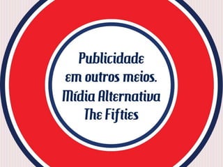 O documento discute a publicidade em outros meios de comunicação na década de 1950, introduzindo a mídia alternativa e o público-alvo.