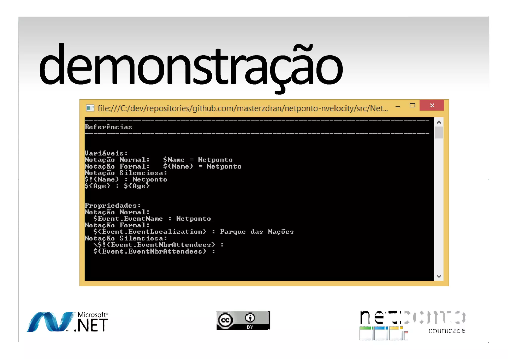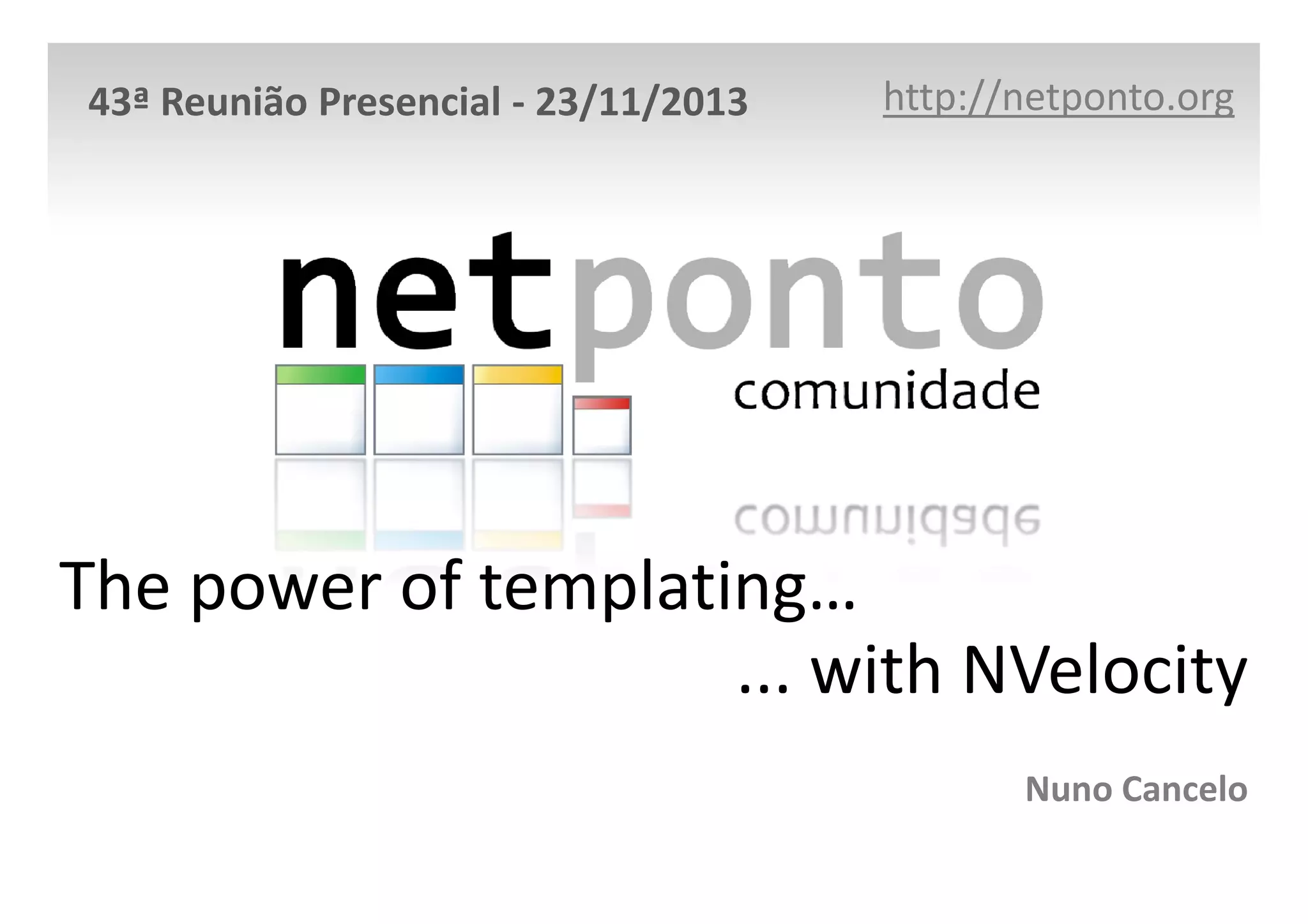 O documento descreve uma reunião presencial realizada em 23 de novembro de 2013. Apresenta informações sobre patrocinadores do evento e datas de próximas reuniões. O documento também resume uma palestra sobre NVelocity, incluindo sua sintaxe e diretivas.