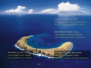 Este documento é uma transcrição da música "The Prayer" de Celine Dion e Andrea Bocelli com tradução para o espanhol. A música pede que Deus nos guie e proteja, nos dê fé e esperança, e nos leve para um lugar seguro, especialmente quando estivermos perdidos ou assustados.