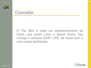 O empreendimento The Slim da construtora Cádiz trará o conceito "EASY LIFE" para morar bem com facilidades. Localizado na Avenida Protásio Alves, terá uma torre de 14 pavimentos com 78 unidades de 2 dormitórios com infraestrutura como elevadores, segurança e áreas comuns como clube, jardim e escritório.