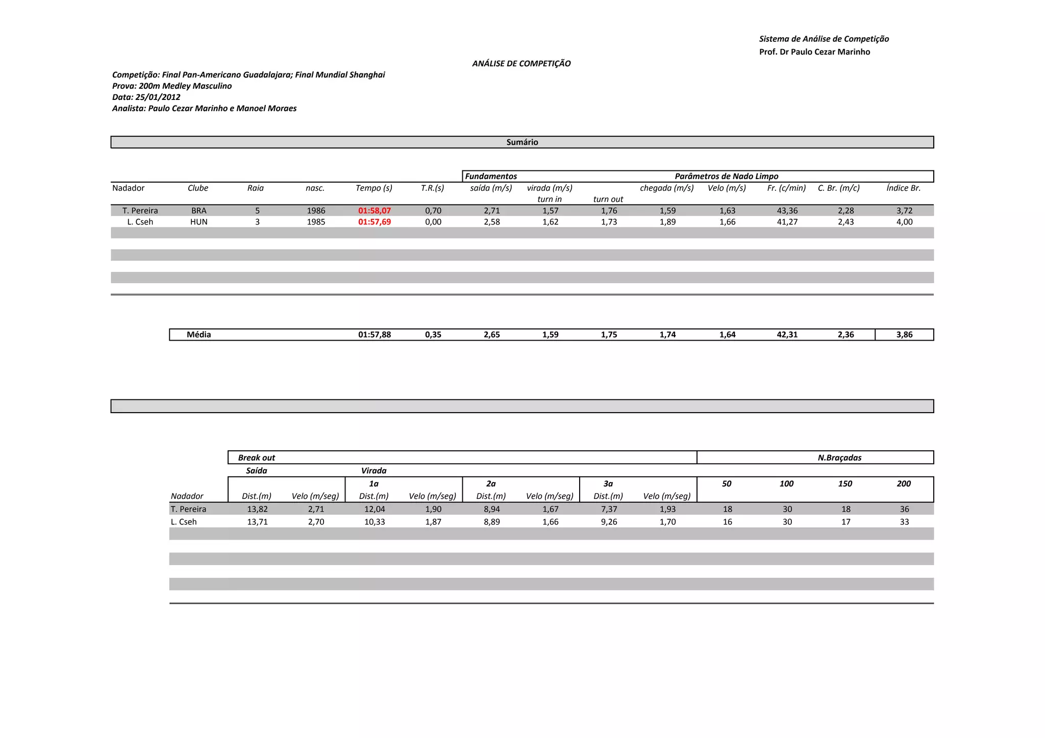 O documento apresenta uma análise comparativa do desempenho de dois nadadores, T. Pereira e L. Cseh, na prova dos 200m medley masculino. Fornece detalhes sobre os tempos, velocidades e parâmetros biomecânicos de cada nadador ao longo da prova, como saída, viradas, frequência de braçadas e comprimento de braçada. A análise indica que L. Cseh teve um desempenho ligeiramente melhor que T. Pereira.