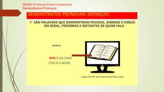 O documento discute os pronomes demonstrativos em inglês ("this", "that", "these", "those") e como eles são usados para indicar objetos, pessoas e coisas próximas ou distantes do falante. Exemplos ilustram como esses pronomes são usados no singular e no plural, e no masculino e no feminino. O documento também diferencia o uso de "a" e "an" dependendo se a palavra seguinte começa com vogal ou consoante.