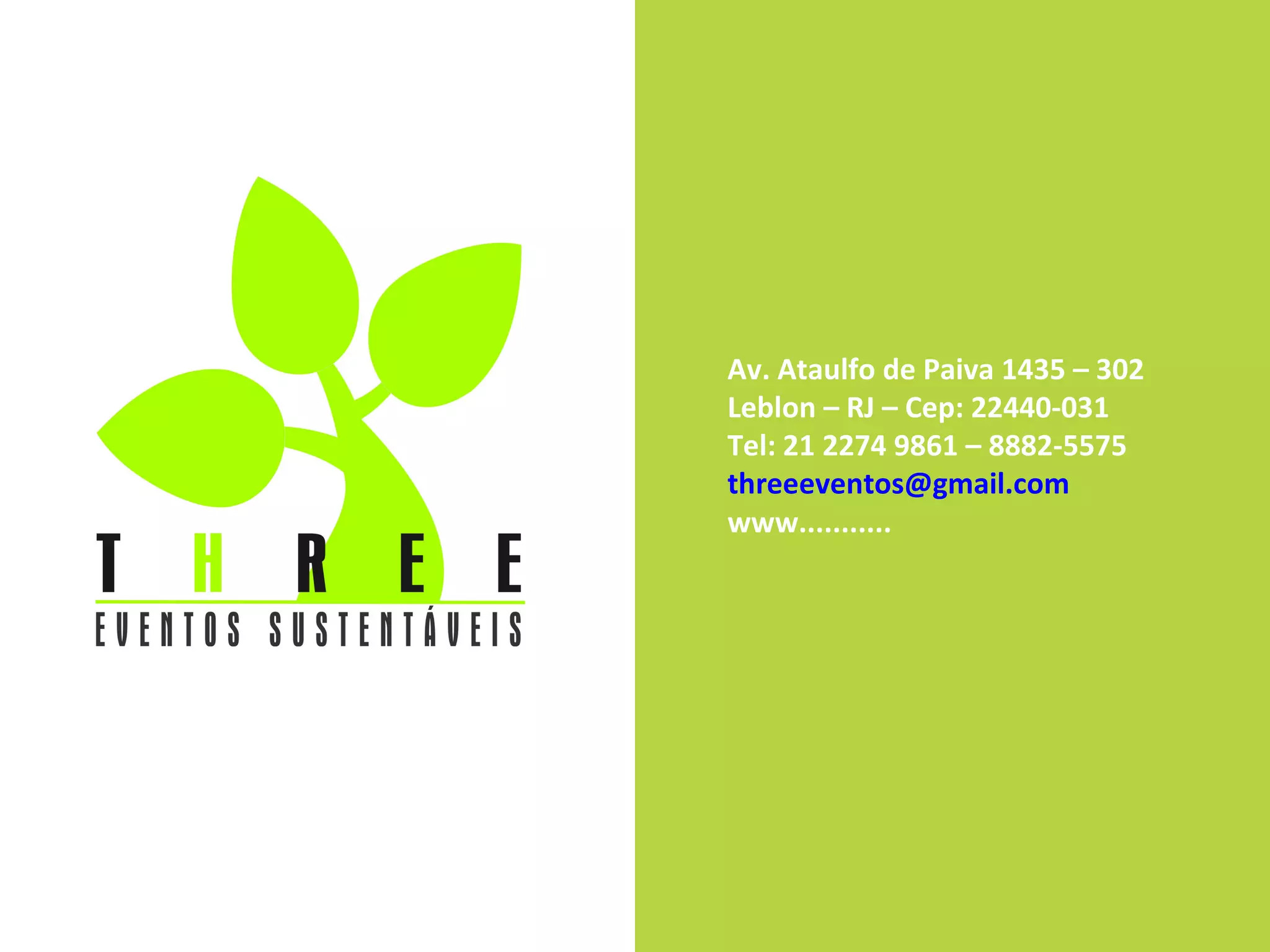 A Three Eventos é uma empresa de eventos sustentáveis que usa materiais recicláveis e naturais como palha, juta e lixo eletrônico para criar cenografias inovadoras. A empresa acredita que o uso consciente de recursos pode satisfazer as necessidades atuais sem comprometer as gerações futuras e ajuda a minimizar a extração de fontes naturais não renováveis.