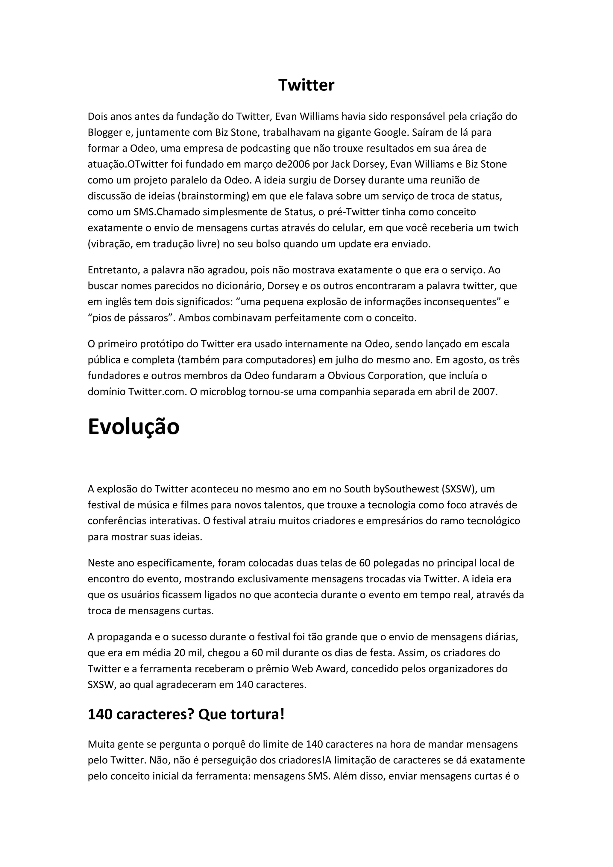 O Twitter foi fundado em 2006 por Jack Dorsey, Evan Williams e Biz Stone como um projeto paralelo da empresa Odeo. O serviço ganhou popularidade no festival SXSW em 2007, quando o número de mensagens diárias triplicou. Atualmente, o Twitter tem mais de 1 milhão de usuários que trocam cerca de 3 milhões de mensagens por dia, apesar de ter experimentado uma desaceleração no crescimento em 2009.