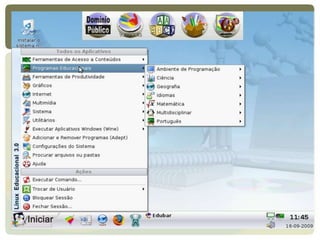 Este documento introduz o curso "Introdução à Educação Digital" e discute a importância da tecnologia na educação. Ele explica o que é hardware e software de computadores e lista alguns exemplos de cada um. Por fim, apresenta o sistema operacional Linux Educacional, destacando suas ferramentas como o BrOffice e programas para internet e gráficos.