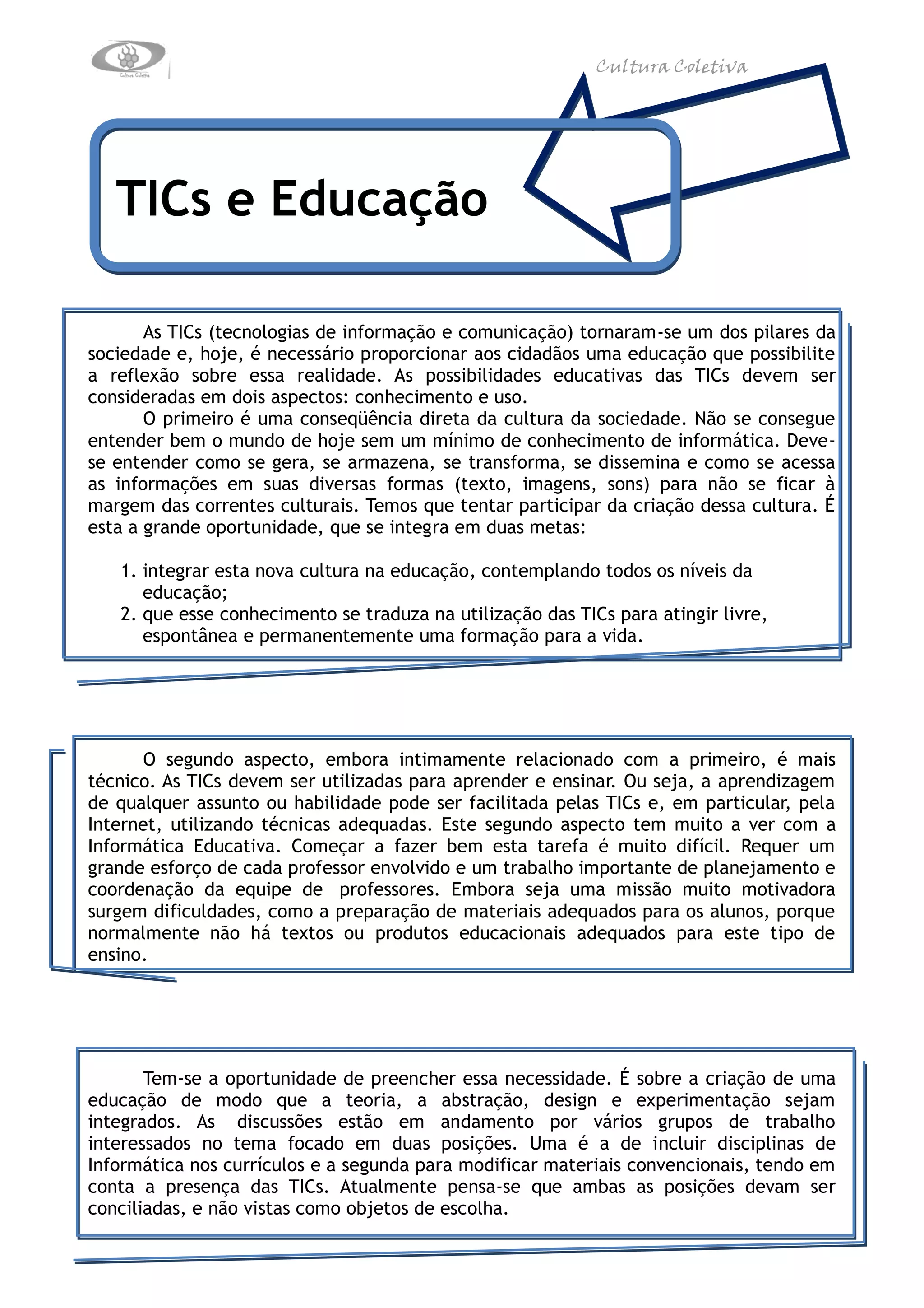 O documento discute a importância das Tecnologias de Informação e Comunicação (TICs) na educação. Ele argumenta que o conhecimento e uso das TICs devem ser integrados em todos os níveis educacionais para que os cidadãos possam participar da cultura digital. Além disso, as TICs devem ser utilizadas para facilitar a aprendizagem de qualquer assunto. Finalmente, é essencial treinar professores no uso pedagógico das TICs para atualizar o sistema educacional.