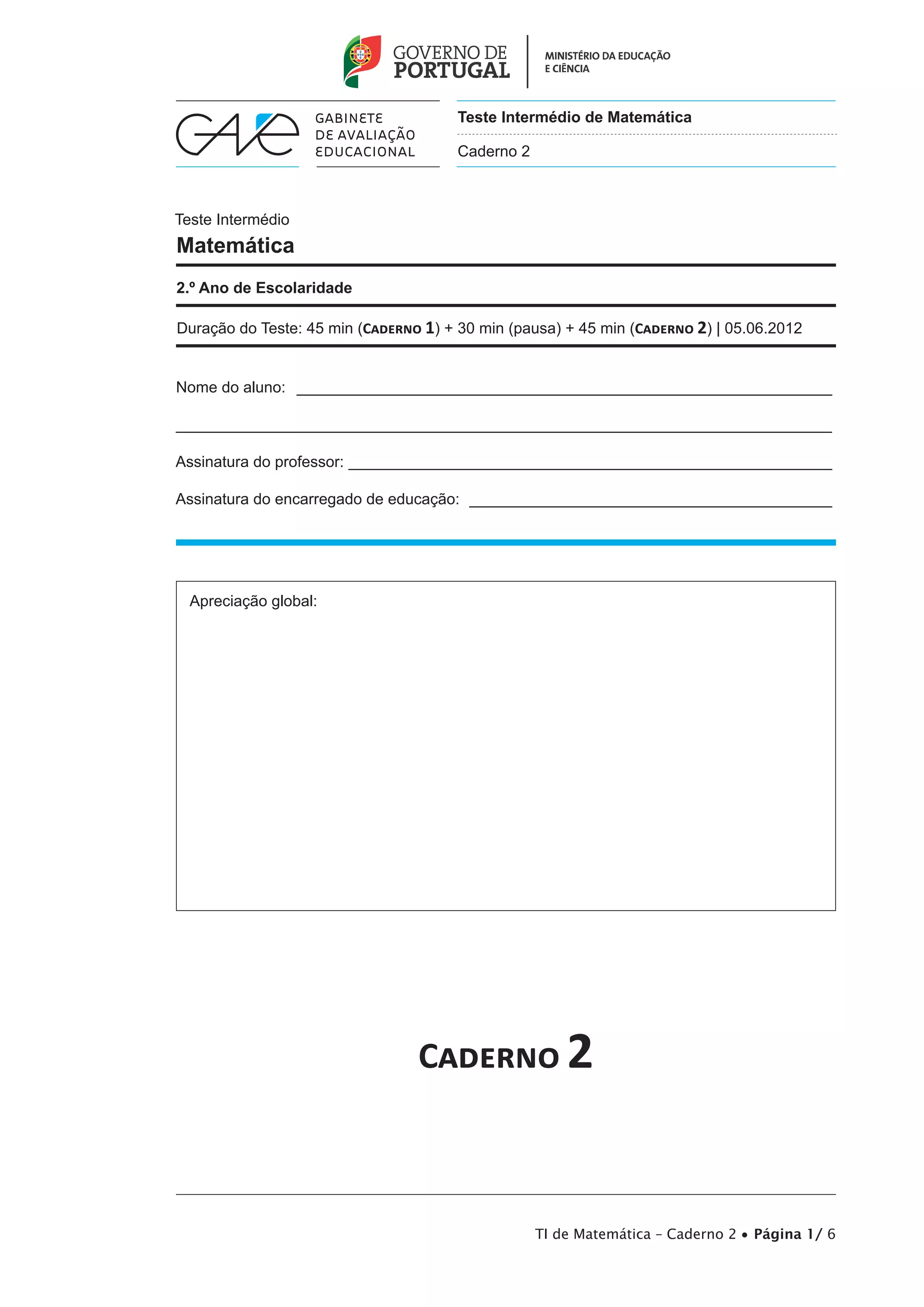 Este documento é o segundo caderno de um teste intermédio de matemática para alunos do 2o ano de escolaridade. Contém 16 questões sobre vários tópicos de matemática como geometria, álgebra e resolução de problemas. As questões incluem desenhos, cálculos, explicações e escolhas múltiplas.