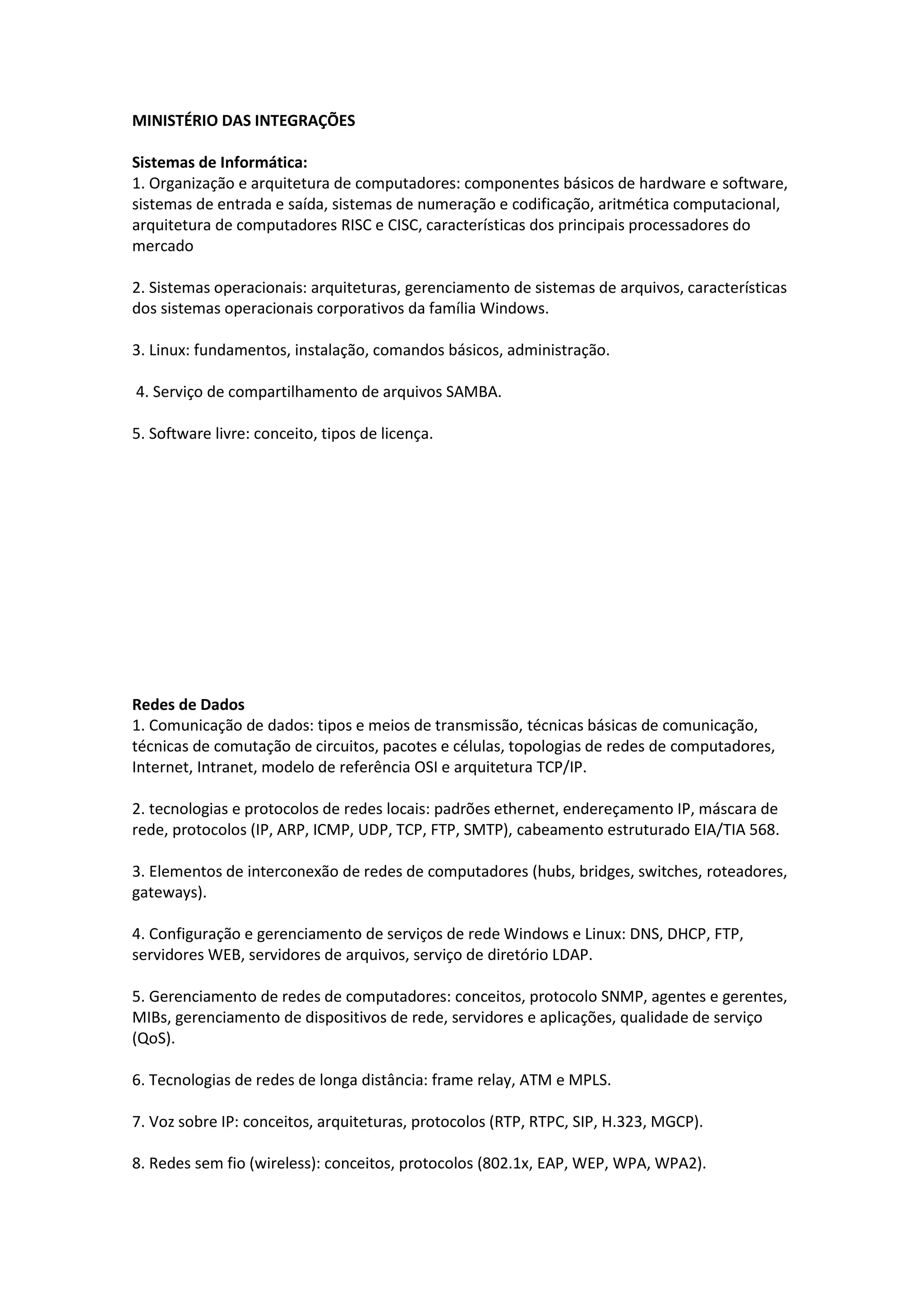 O documento descreve os principais tópicos de sistemas de informática e redes de dados, incluindo a organização de computadores, sistemas operacionais, Linux, redes locais, protocolos de rede, configuração de serviços de rede, gerenciamento de redes e tecnologias sem fio e de longa distância.
