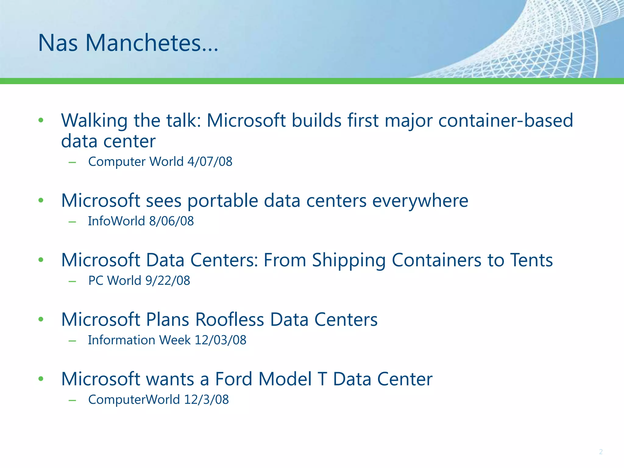 O documento discute a evolução dos datacenters, enfatizando a transição para modelos mais sustentáveis e a necessidade de eficiência energética. Apresenta dados sobre consumo de energia, infraestrutura e a crescente importância de soluções modulares como containers para melhorar a performance e reduzir custos. A Microsoft está liderando essa mudança com projetos que promovem datacenters ecológicos e iniciativas para minimizar o impacto ambiental.
