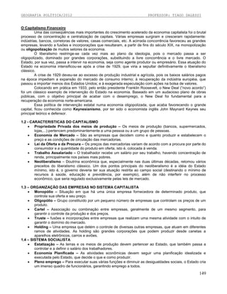 Este documento apresenta um resumo sobre os principais tópicos abordados no Capítulo 1 do livro "Geografia Política" de 2012. Inicialmente, descreve as fases do capitalismo comercial, industrial e financeiro e suas principais características. Também aborda as características do sistema socialista e da Guerra Fria, incluindo a divisão do mundo em blocos capitalista e socialista. Por fim, resume os principais fatores que levaram ao fim da Guerra Fria e da bipolaridade mundial, como a crise econômica na União