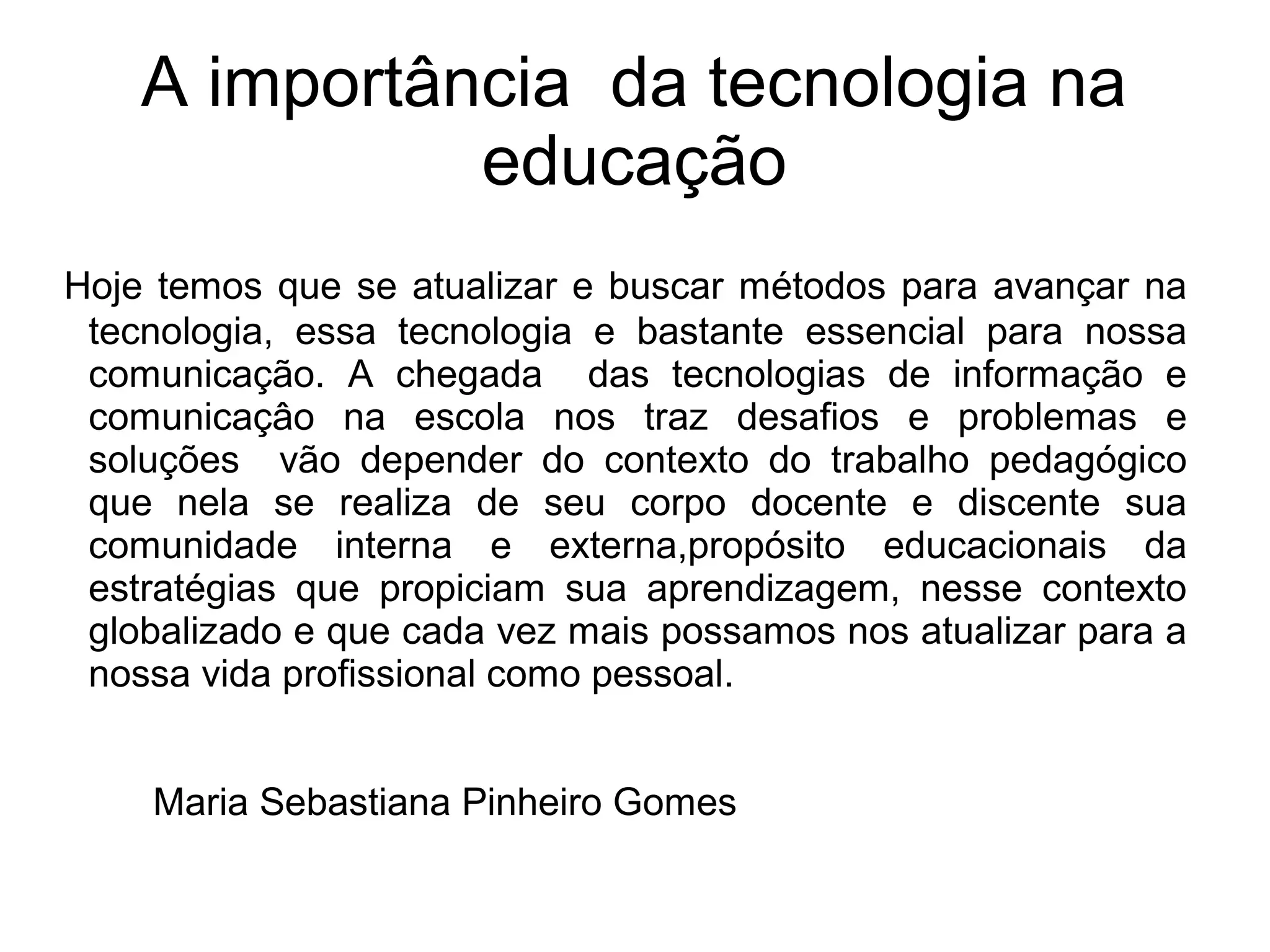 O documento discute a importância da tecnologia na educação, notando que é essencial para comunicação e que sua chegada nas escolas traz desafios e soluções que dependem do contexto pedagógico, corpo docente e discente, comunidade e propósitos educacionais da instituição.