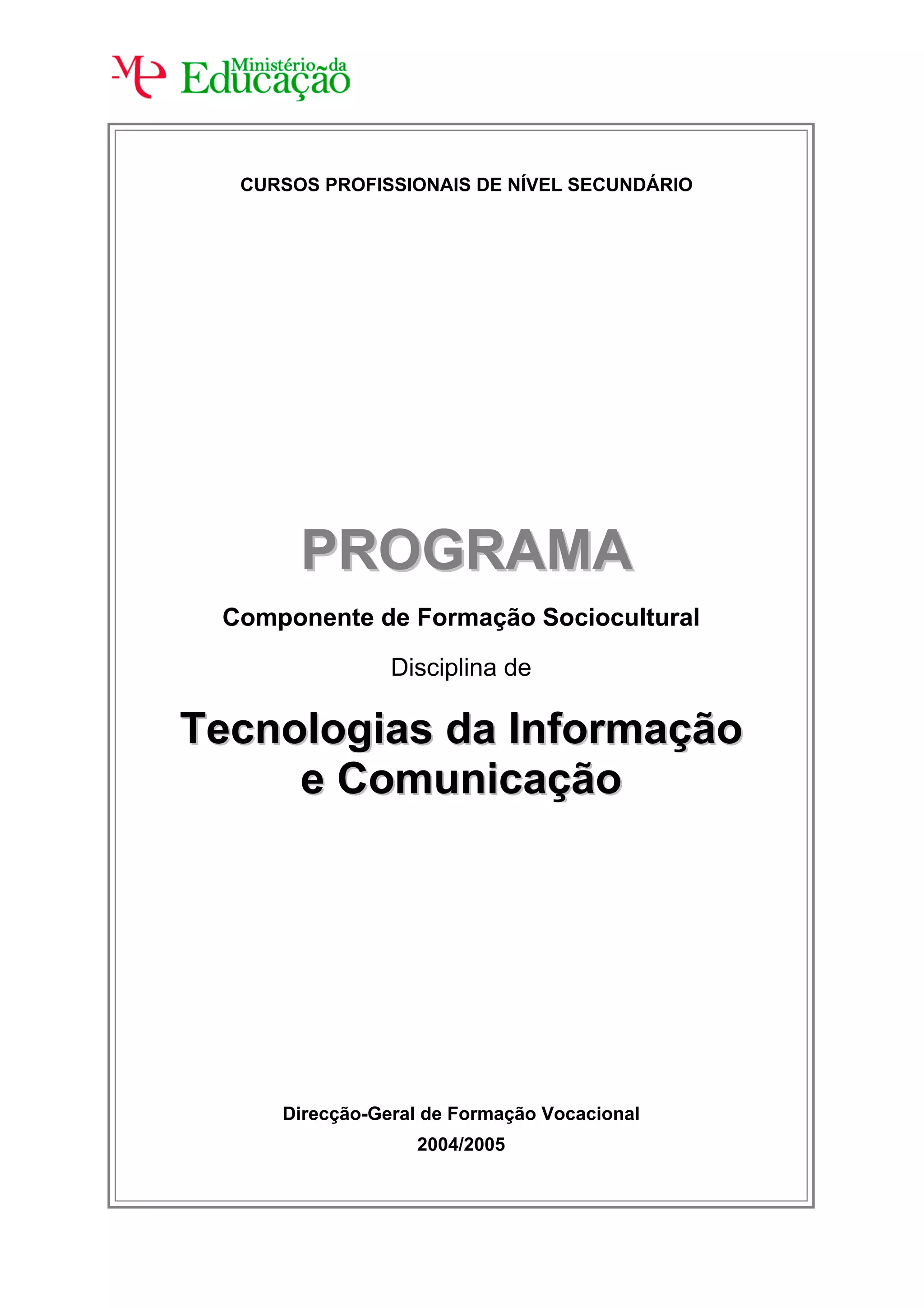 Este documento apresenta o programa da disciplina de Tecnologias da Informação e Comunicação para os cursos profissionais. O programa é estruturado em módulos com competências definidas e inclui módulos base obrigatórios e módulos alternativos opcionais. O programa visa garantir que os alunos desenvolvam literacia digital e competências essenciais em ferramentas de informática.