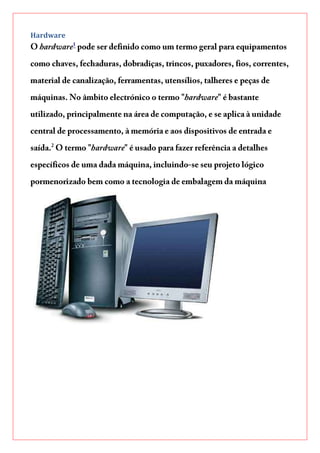 O documento resume os principais componentes de hardware e software de um computador. No hardware, descreve o monitor, a torre, o rato, a memória e o processador. No software, descreve os sistemas operacionais Microsoft Windows e Linux.