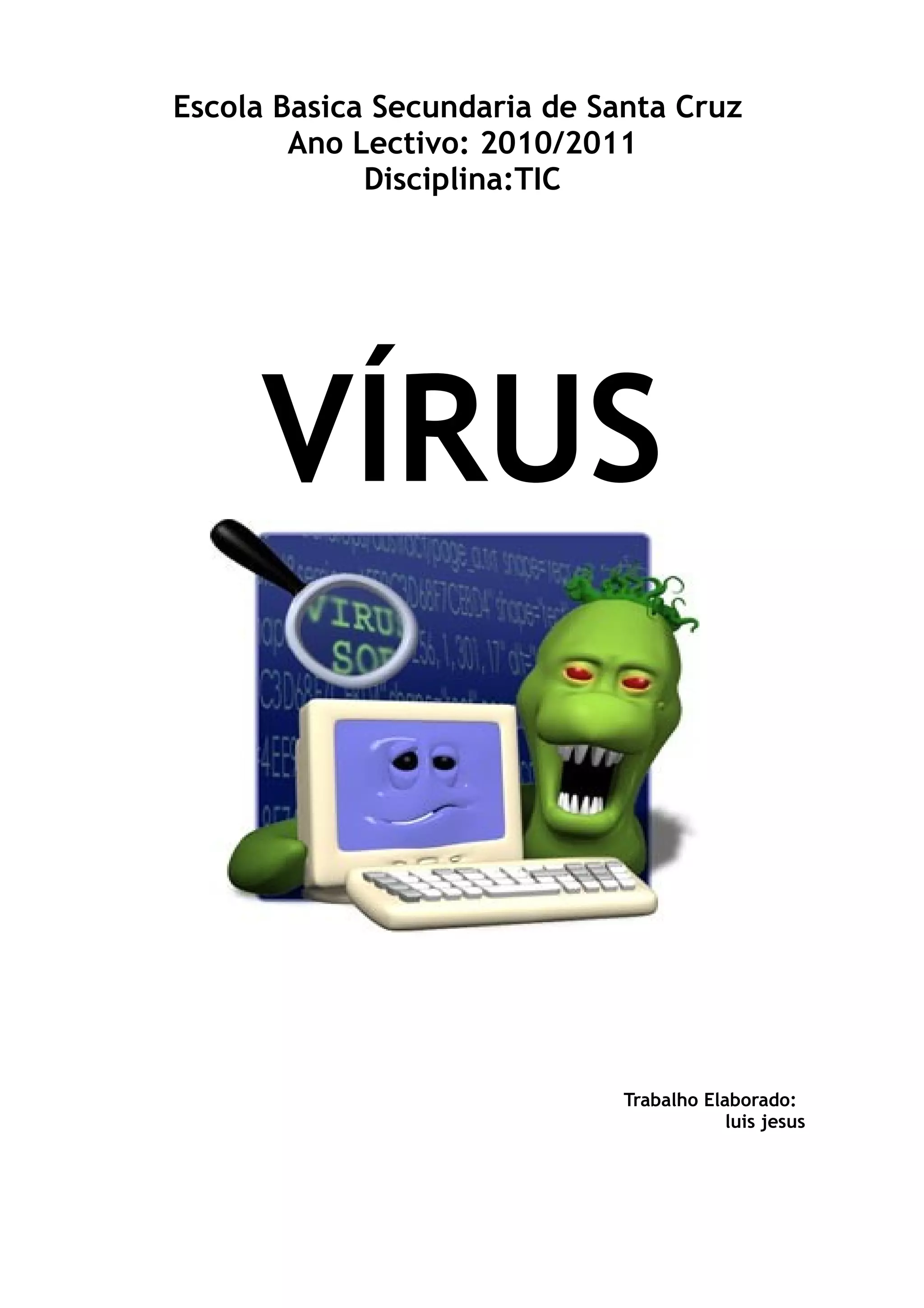Este documento discute vários tipos de vírus de computador e como se proteger contra eles. Explica que vírus são programas maliciosos que se espalham e tentam infectar outros computadores, e menciona crackers e hackers. Também lista vários tipos de vírus como vírus de boot e cavalos de Tróia, e explica que vírus podem ser transmitidos por disquetes, e-mail e pen drives, enfatizando a importância de manter um antivírus atualizado para proteção.