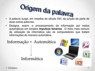 Informática descreve o conjunto de ciências da informação como computação, teoria da informação, processamento de dados e modelagem de conhecimento. A palavra surge da junção de "informação" e "automática" para designar o processamento automático de informações binárias, geralmente por computadores. Burótica refere-se aos métodos e ferramentas para tratar informações escritas, visuais ou sonoras em escritórios. Tecnologia da Informação cria, administra e mantém a gestão de dados através de dispositivos de acesso,
