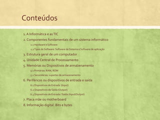 O documento apresenta uma introdução à informática e às tecnologias da informação e comunicação (TIC), explorando conceitos como hardware, software, estrutura de computadores e dispositivos de entrada e saída. Ele discute a evolução da informática desde sua definição até aplicações em áreas como robótica e automação. O texto também detalha as memórias, a placa-mãe e como a informação digital é representada e manipulada em sistemas computacionais.