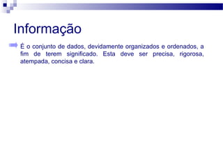 O documento discute a origem da palavra informática e o que é informação. Também descreve como os dados são armazenados digitalmente no computador usando códigos binários de 0 e 1. Detalha os componentes principais de um sistema de computador, incluindo hardware, software, dispositivos de entrada e saída.