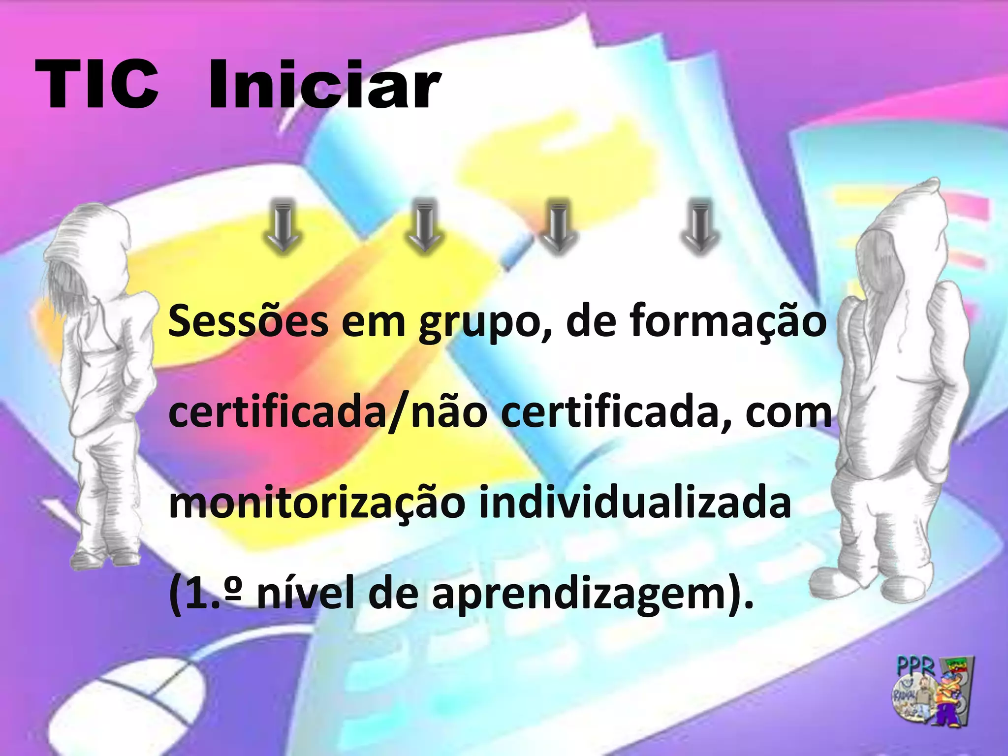 Este documento descreve um programa de formação em Tecnologias de Informação e Comunicação (TIC) que oferece sessões em grupo e individuais para crianças, jovens, famílias e a comunidade, com o objetivo de aumentar as qualificações digitais dos participantes. O programa usa currículos e ferramentas digitais em duas fases, com métodos tradicionais e de autoaprendizagem, e teve mais participantes do que o previsto.