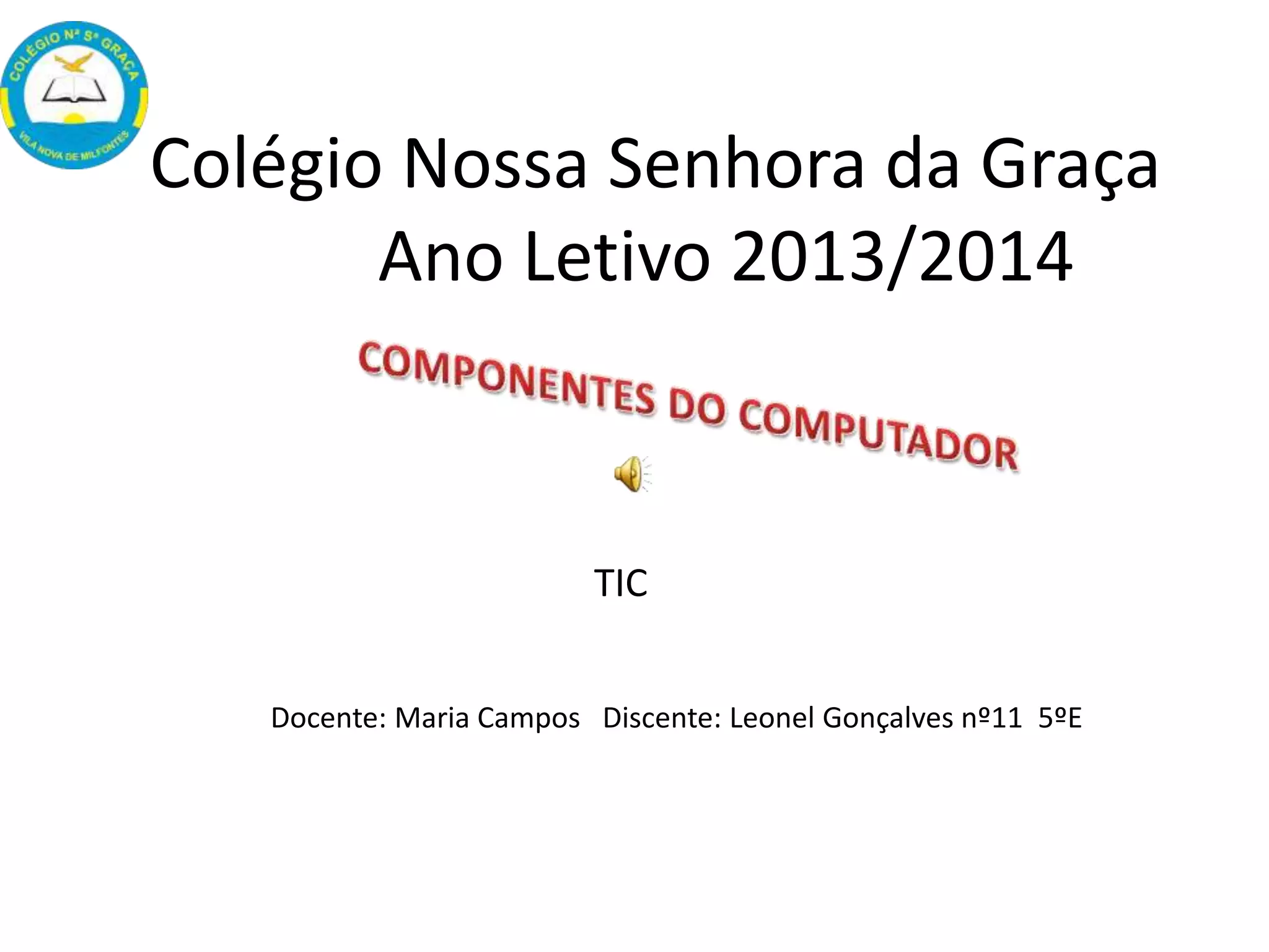 Este documento lista os principais componentes de um computador e fornece uma breve descrição de cada um, incluindo a motherboard, fonte de alimentação, ventoinha, processador, pilha, disco rígido, memória RAM, memória ROM, cache de memória, mouse, monitor, torre, leitor e teclado. Ele também fornece uma webografia sobre as fontes das imagens utilizadas.