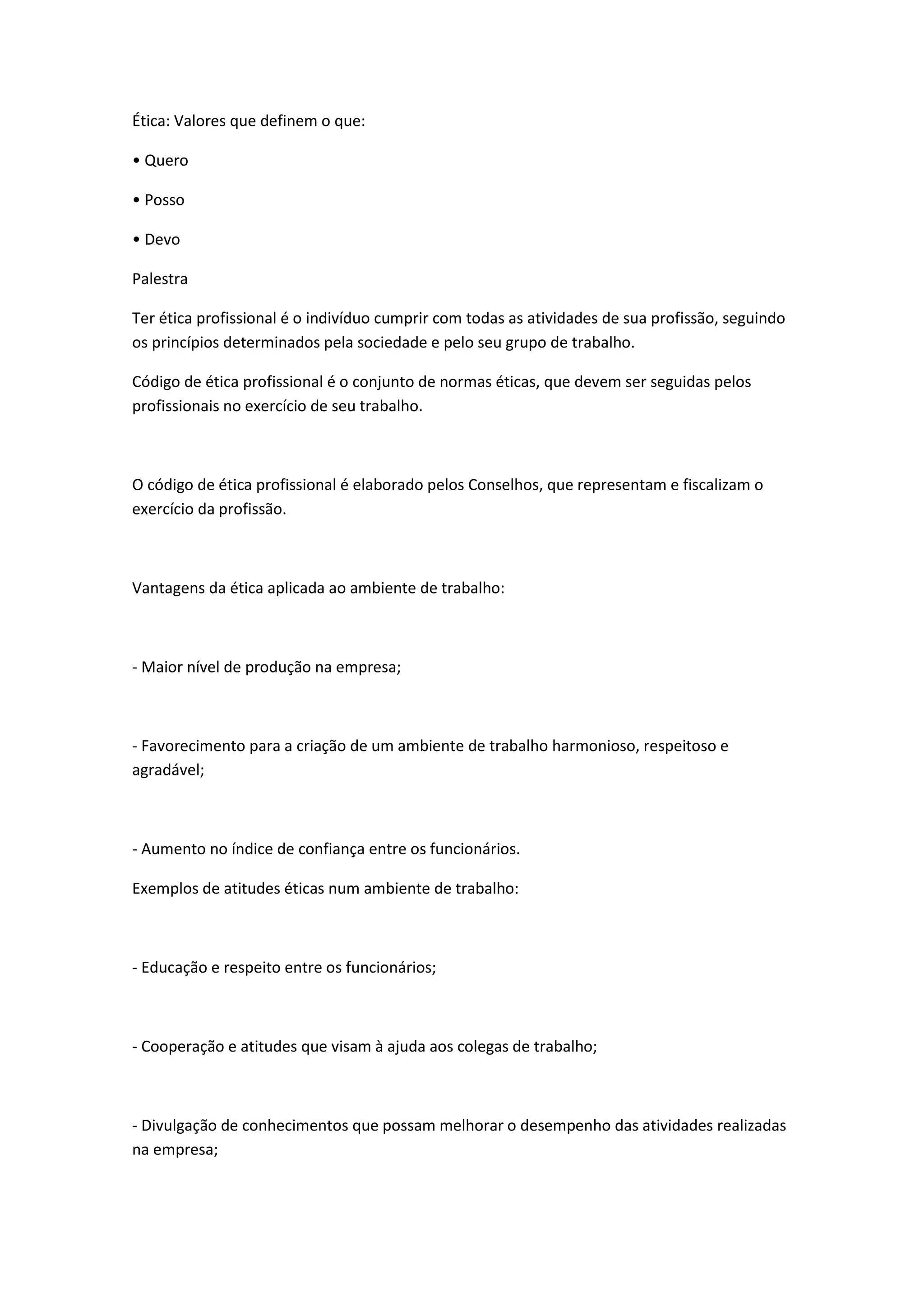 O documento discute os conceitos de ética profissional, código de ética e atitudes éticas no ambiente de trabalho. A ética profissional envolve cumprir com as atividades da profissão seguindo princípios determinados pela sociedade e grupo de trabalho. Códigos de ética são elaborados por conselhos para fiscalizar o exercício da profissão. Atitudes éticas incluem educação, respeito, cooperação e divulgação de conhecimento para melhorar o desempenho da empresa.