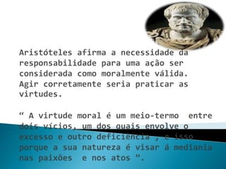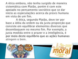 A ética busca a fundamentação teórica para o melhor modo de viver, relacionada à opção de realizar a vida mantendo relações justas com os outros. A palavra ética significa "modo de ser" e trata do comportamento humano pelo seu valor moral. Aristóteles defendia que a justiça é alcançada evitando os extremos e buscando o meio termo nas ações.