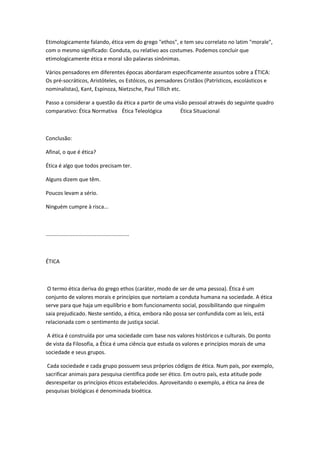 O documento discute o significado e diferenças entre ética e moral. A ética se refere ao estudo filosófico dos princípios que orientam a conduta humana, buscando fundamentar o melhor modo de viver através do pensamento. Já a moral se baseia na obediência a normas culturais e religiosas. A ética inclui campos como antropologia e sociologia que influenciam o estilo de vida, enquanto a moral é entendida como costumes.