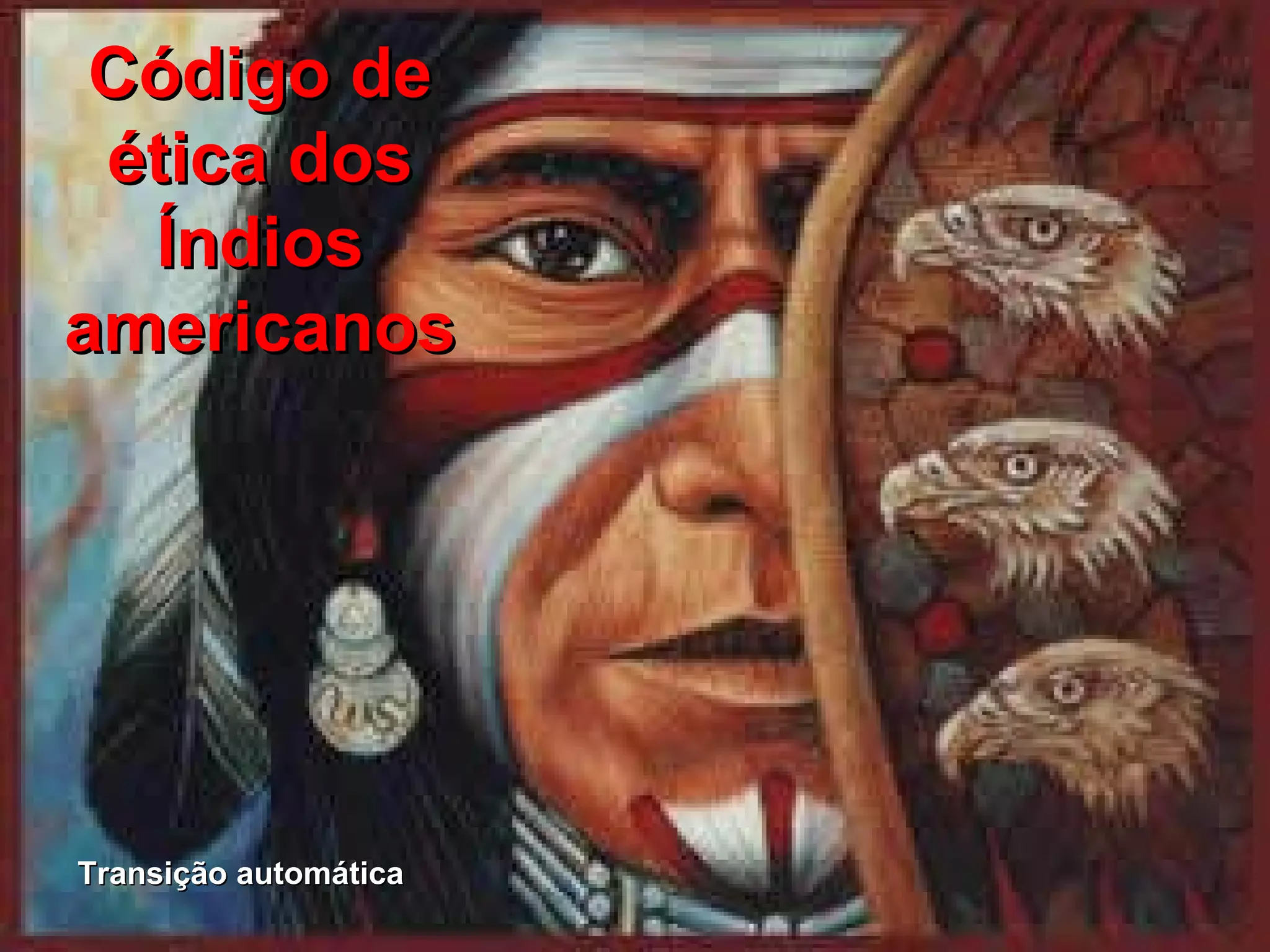 Este documento apresenta um código de ética dos povos indígenas americanos, enfatizando a importância da oração, tolerância, autoconhecimento, hospitalidade, respeito pela natureza, crianças e propriedade alheia, honestidade, equilíbrio mental e espiritual, responsabilidade pelas ações, privacidade e compartilhamento com os necessitados.