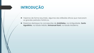 O documento resume as principais concepções éticas de diferentes períodos históricos, destacando Aristóteles, Santo Agostinho e Immanuel Kant. Aristóteles defendia que a felicidade é o fim último do ser humano e que a virtude é alcançada por meio da razão. Santo Agostinho introduziu a ideia de livre-arbítrio e que cada um pode escolher entre o bem e o mal. Kant defendia que a razão humana pode elaborar normas universais e que um ato só é moral quando praticado por dever.